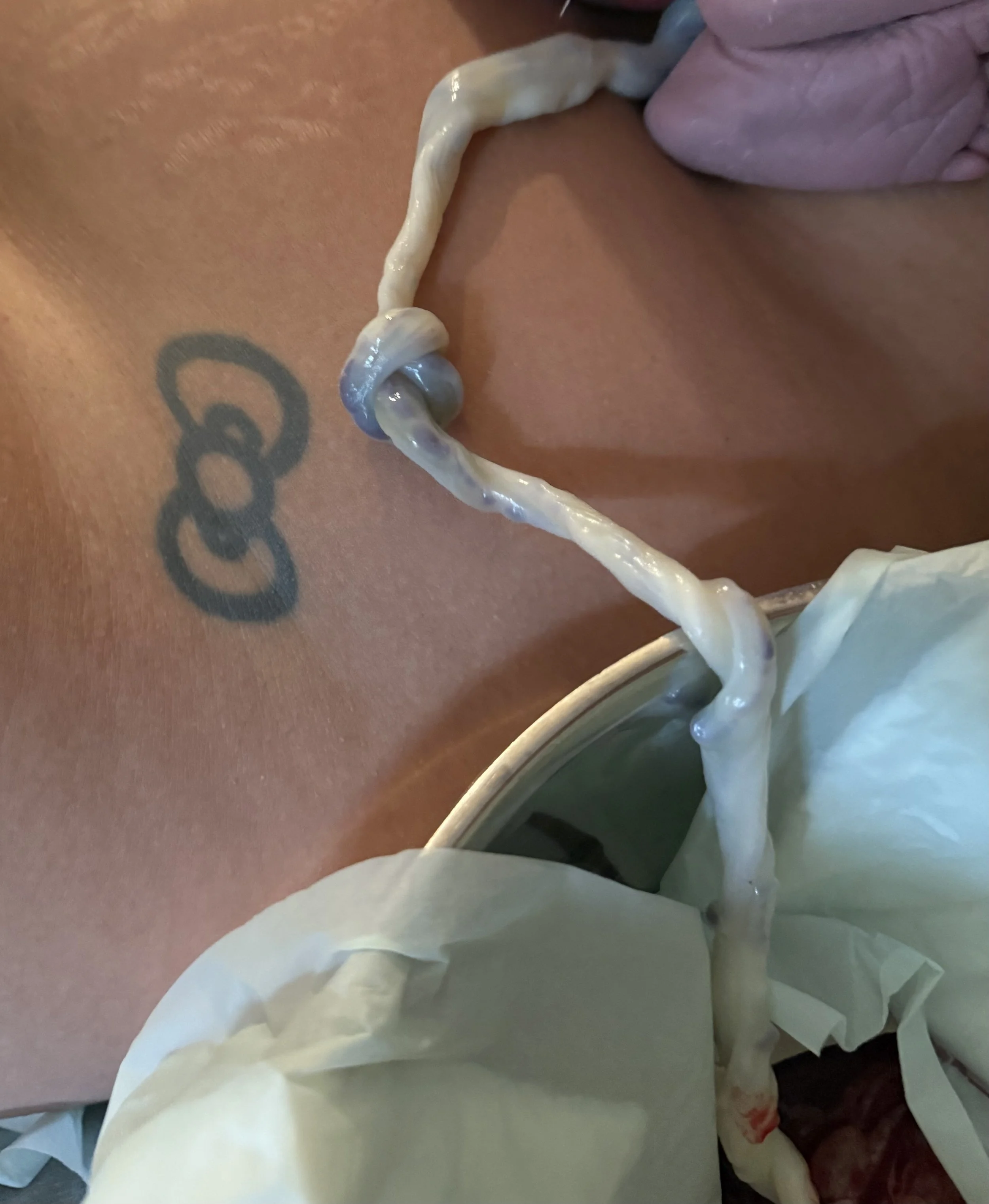 His umbilical cord had a true knot—a rare phenomenon the midwives were surprised and excited to see. At some point in the pregnancy, Roman had swam through his cord. When it was fully white and no longer pulsing—about 30 minutes later—Brandon cut it.